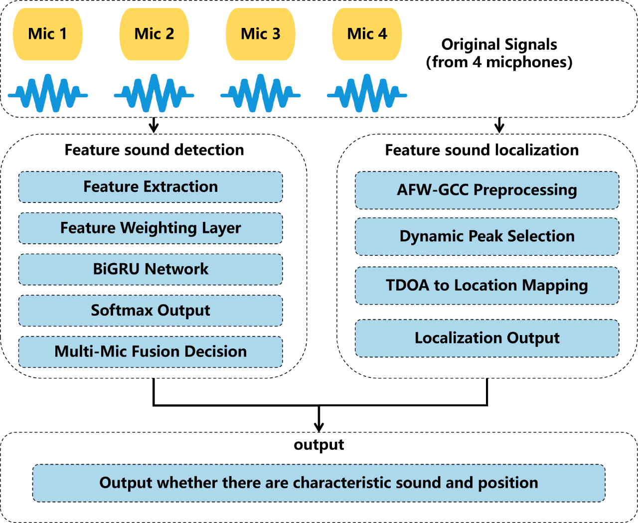 图3 系统算法流程示意图。BiGRU模型用于异常声识别,AFW-GCC算法实现高精度声源定位。