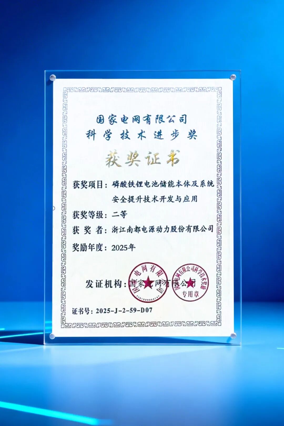 日前,南都电源参研的“磷酸铁锂电池储能本体及系统安全提升技术开发与应用” 项目,荣获国家电网有限公司 2025 年度科学技术进步二等奖。