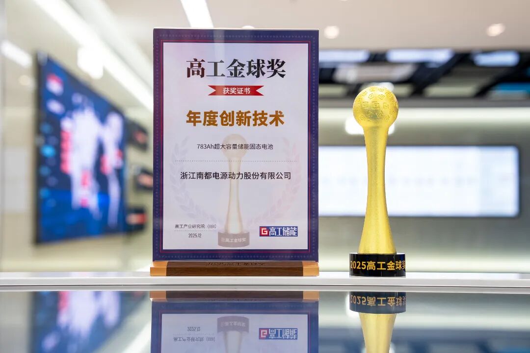 日前,2025高工储能年会在深圳圆满落幕。南都电源凭借自主研发的783Ah 超大容量储能固态电池,一举斩获“高工金球奖年度创新产品奖”。